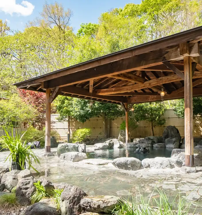 自然を満喫できる開放的な露天風呂は、木の優しさを感じる檜風呂と、自然の素朴な雰囲気を堪能できる岩風呂をご用意。pH11.1を誇るアルカリ性の泉質は美肌の湯とも呼ばれ関東有数の名湯として知られています。秩父巡礼の立ち寄り湯としても親しまれています。