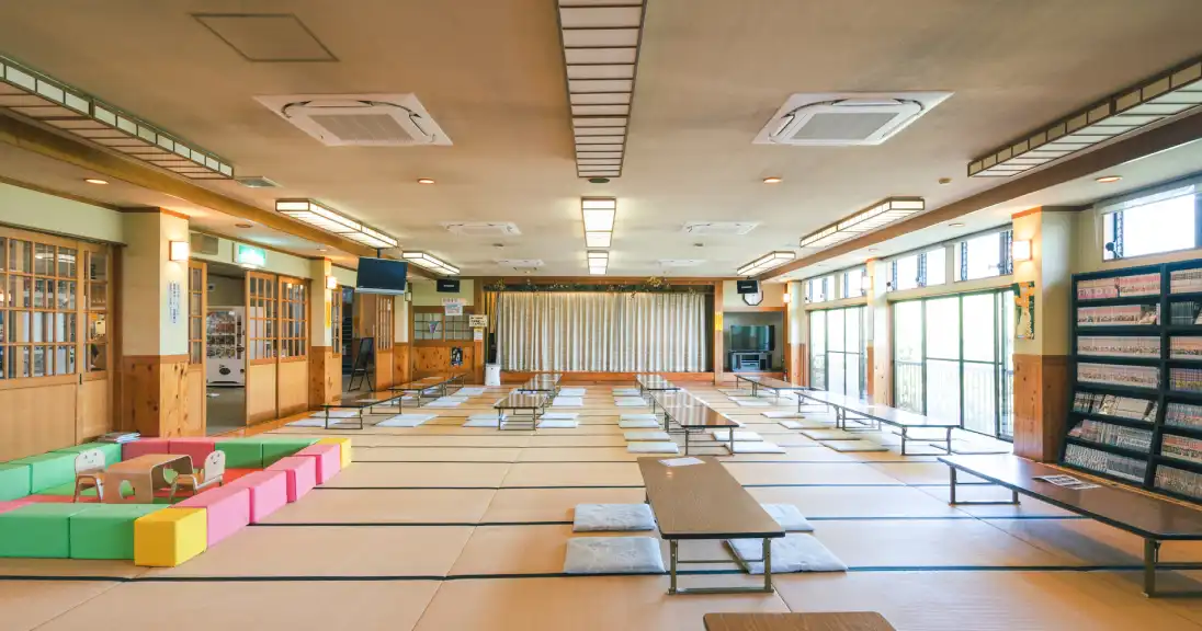 誰でも自由にご利用いただける90畳の大広間。正面の窓からは横瀬川を一望できます。カラオケをはじめ、毎週の定例イベントを多数開催中。イベント詳細はお知らせで随時更新中です。